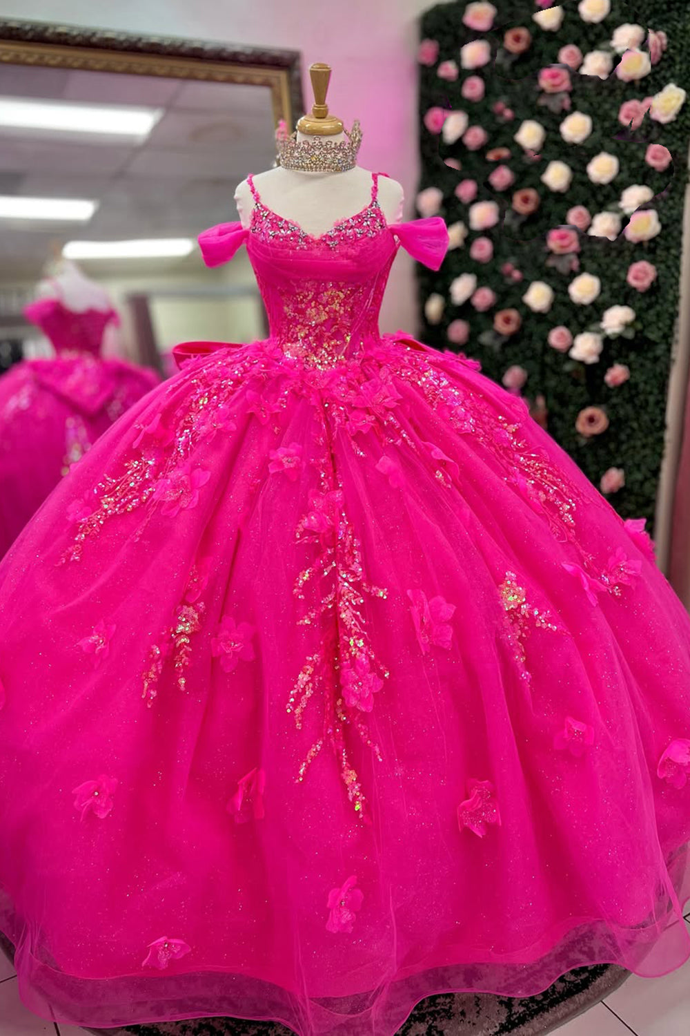 3D Floral Sparkly Fuchsia Corset Appliques Beads Cold Shoulder Quinceanera Dress