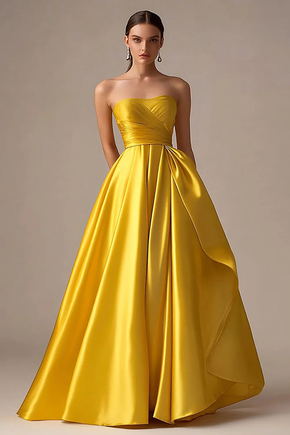 Yellow Strapless Satin A Line Long Formal Dress