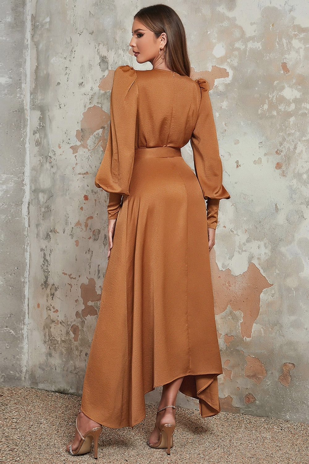 Camel A-Line Wrap V Neck Long Sleeves Long Prom Dress with Belt