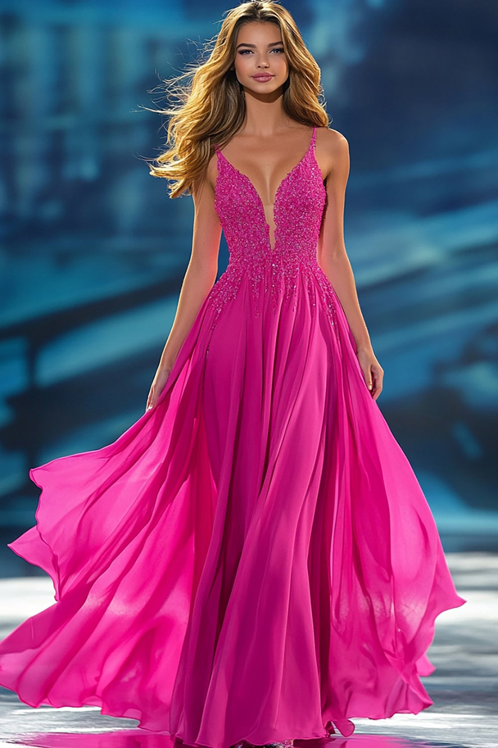 Hot Pink A Line Beaded Chiffon Prom Dress