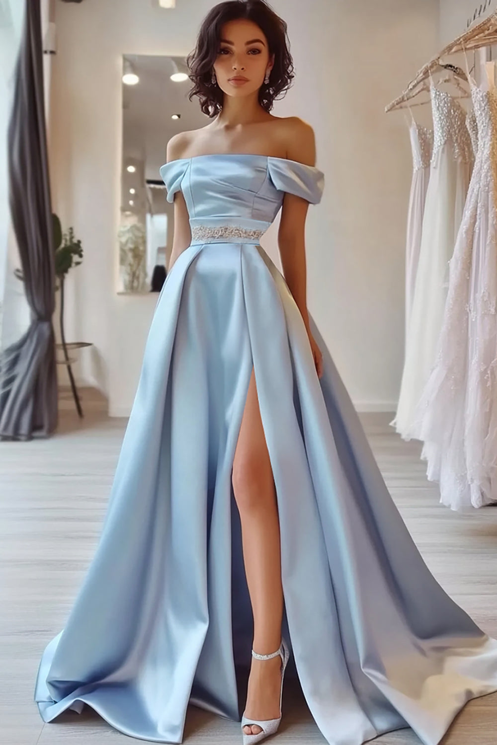 Off The Shoulder A Line Blue Prom Dress with Slit