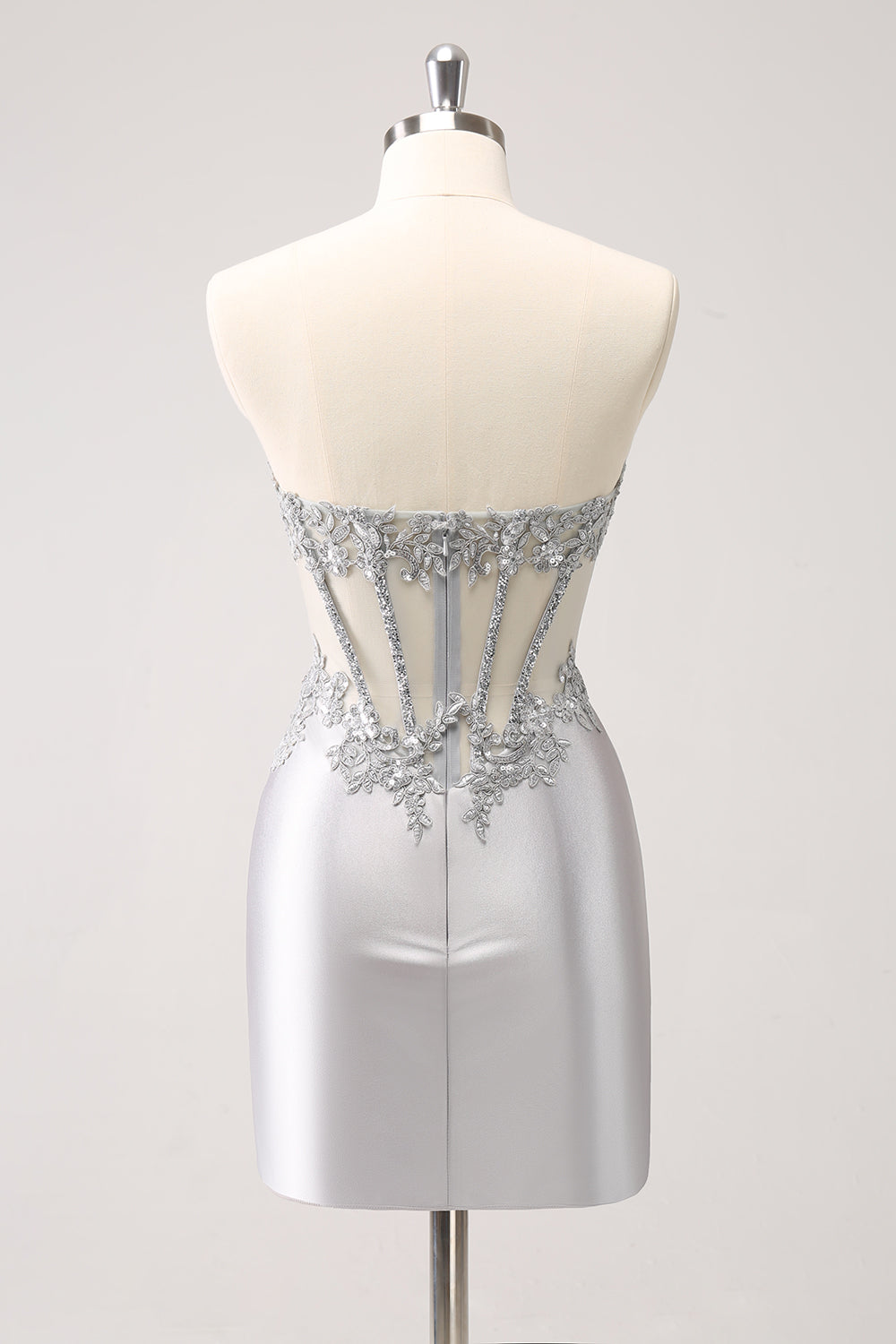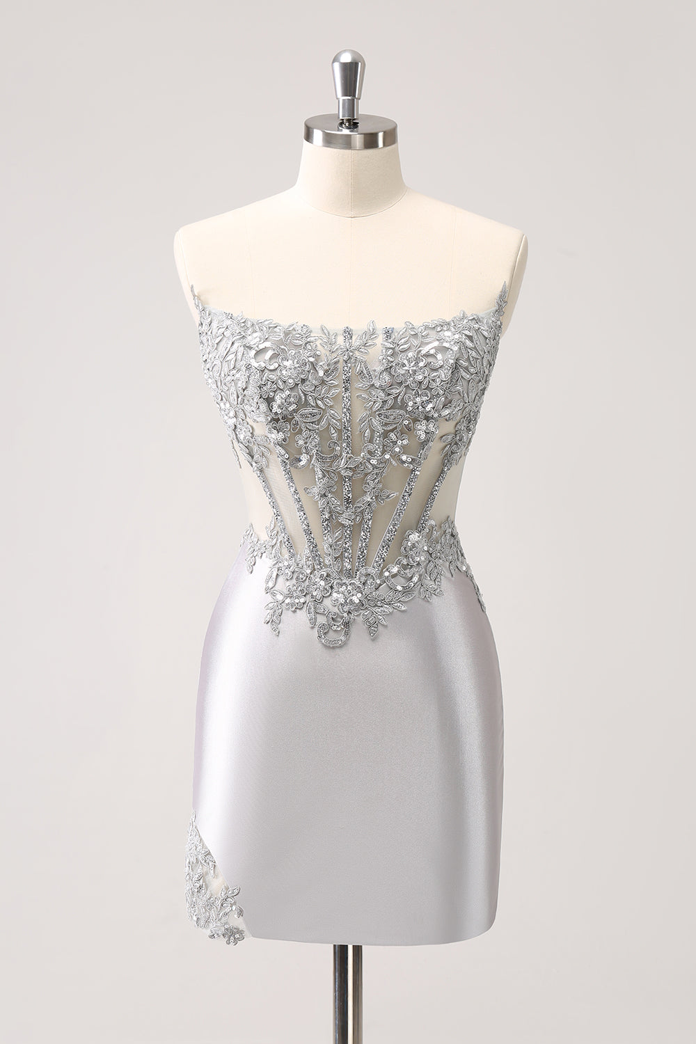 Strapless Silver Glitter Corset Homecoming Dress With Appliques