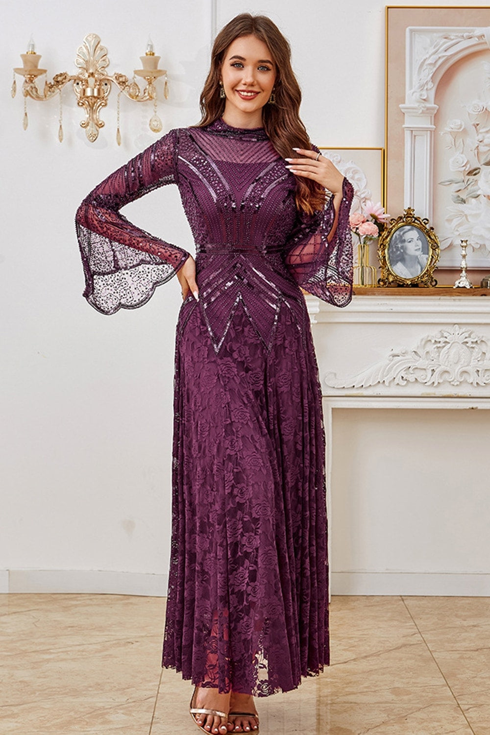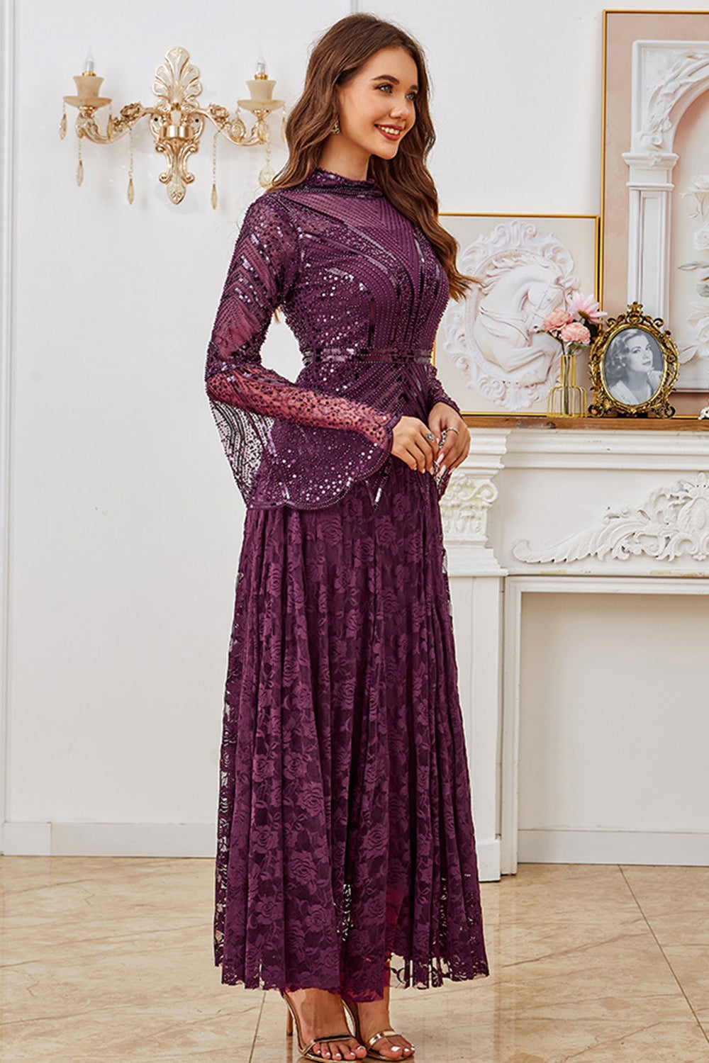 Sparkly Dark Purple Lace A Line Formal Dress with Sequins