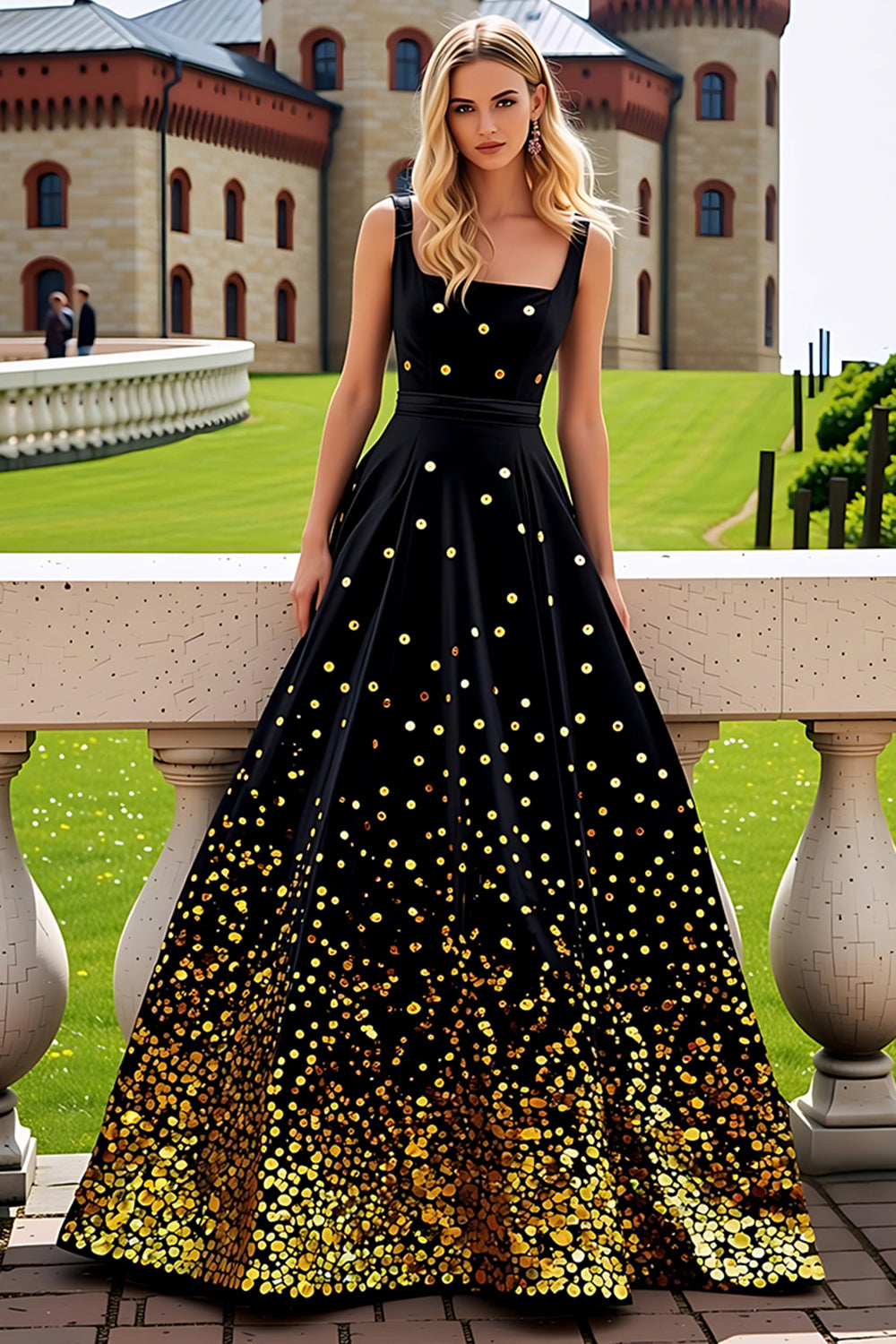 Sparkly Black Golden A Line Square Neck Long Prom Dress with Sequins