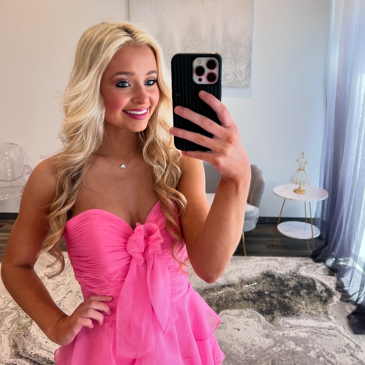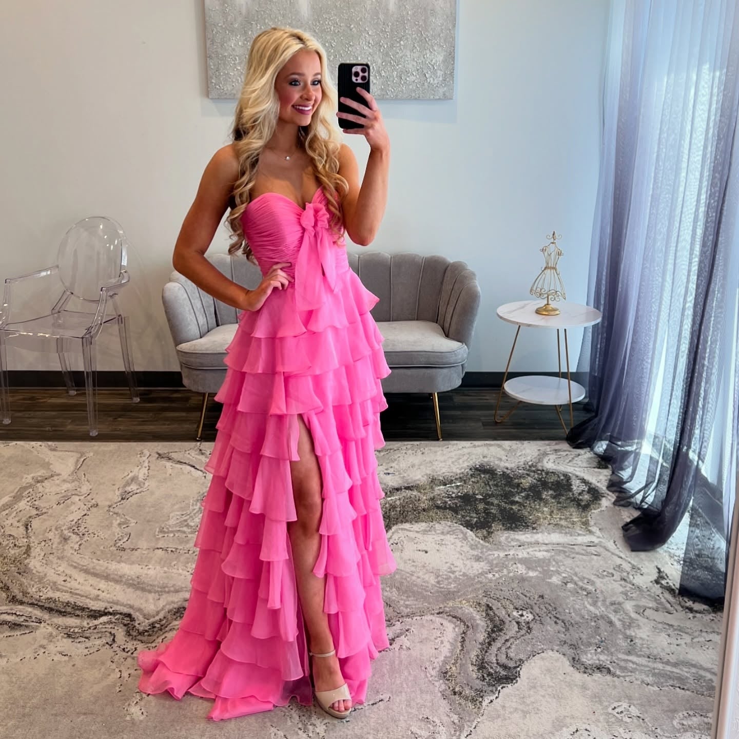 Fuchsia Tiered Bow Pleated Chiffon Strapless Prom Dress with Slit