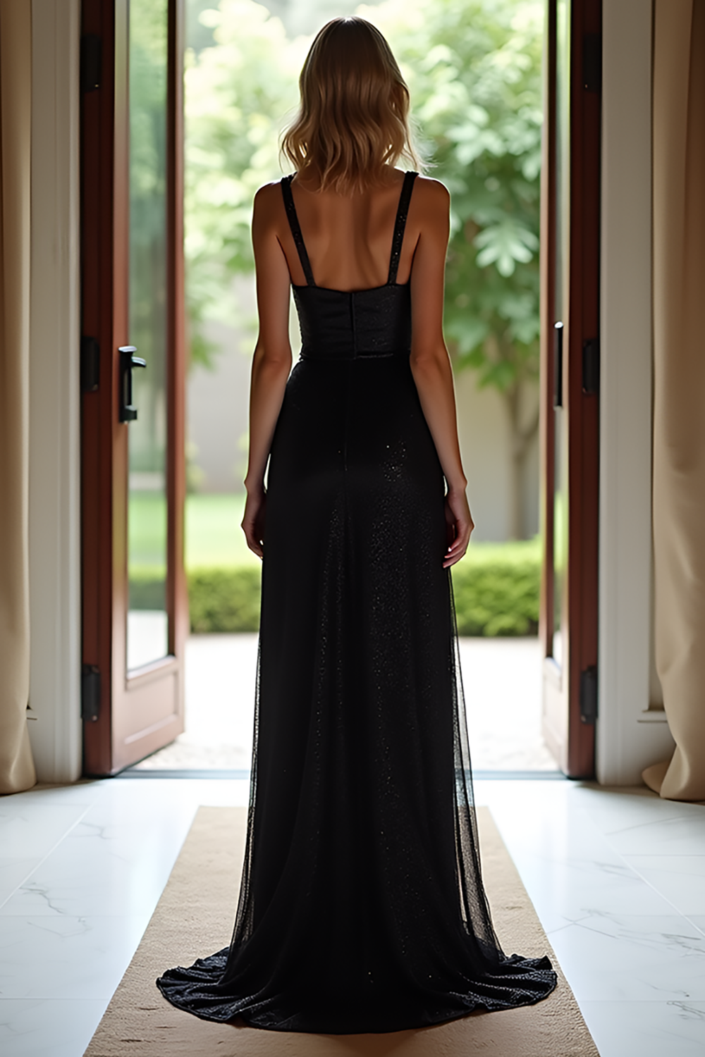 Black Spaghetti Straps A Line Square Neck Long Prom Dress