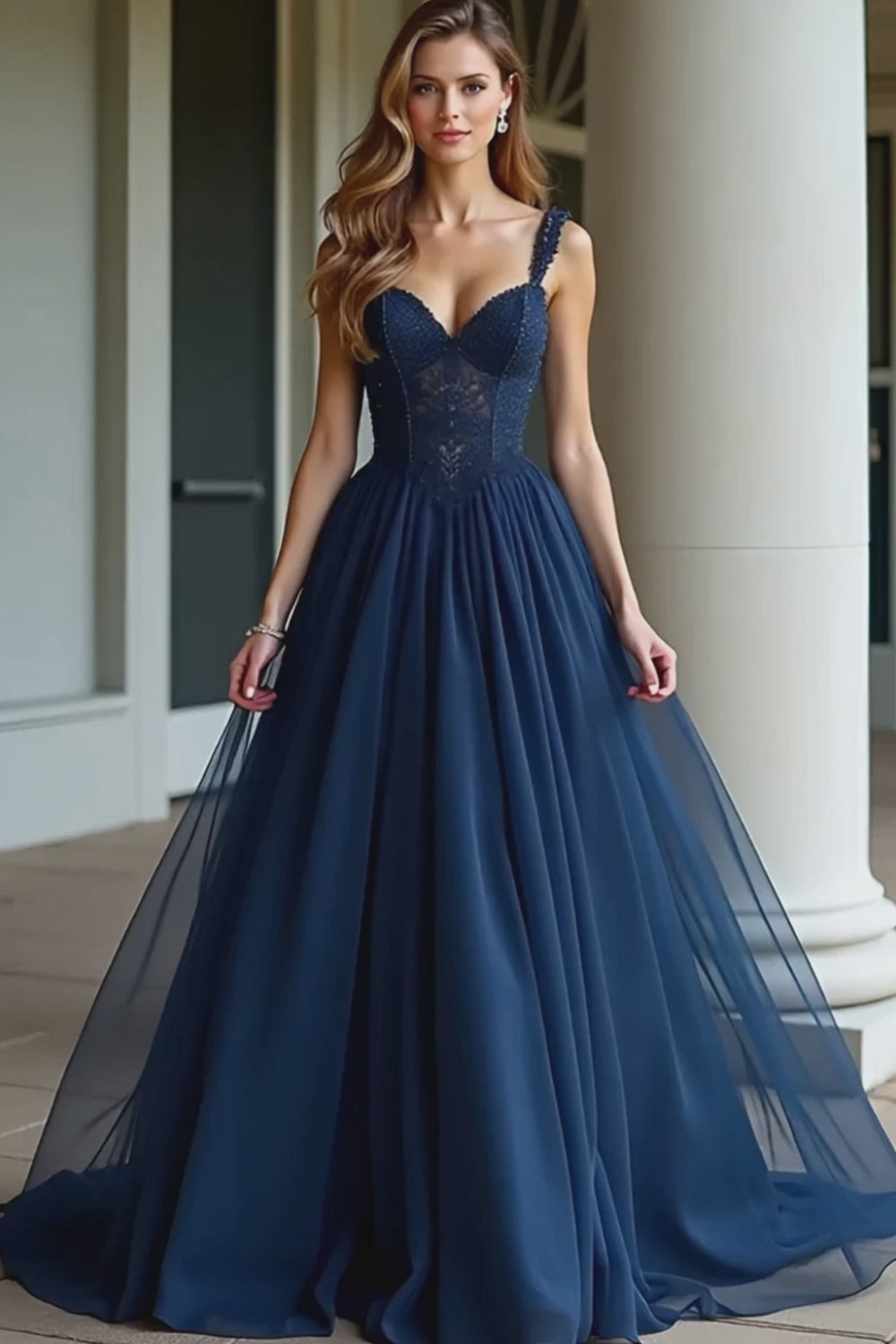Navy Spaghetti Straps A Line Lace Long Prom Dress