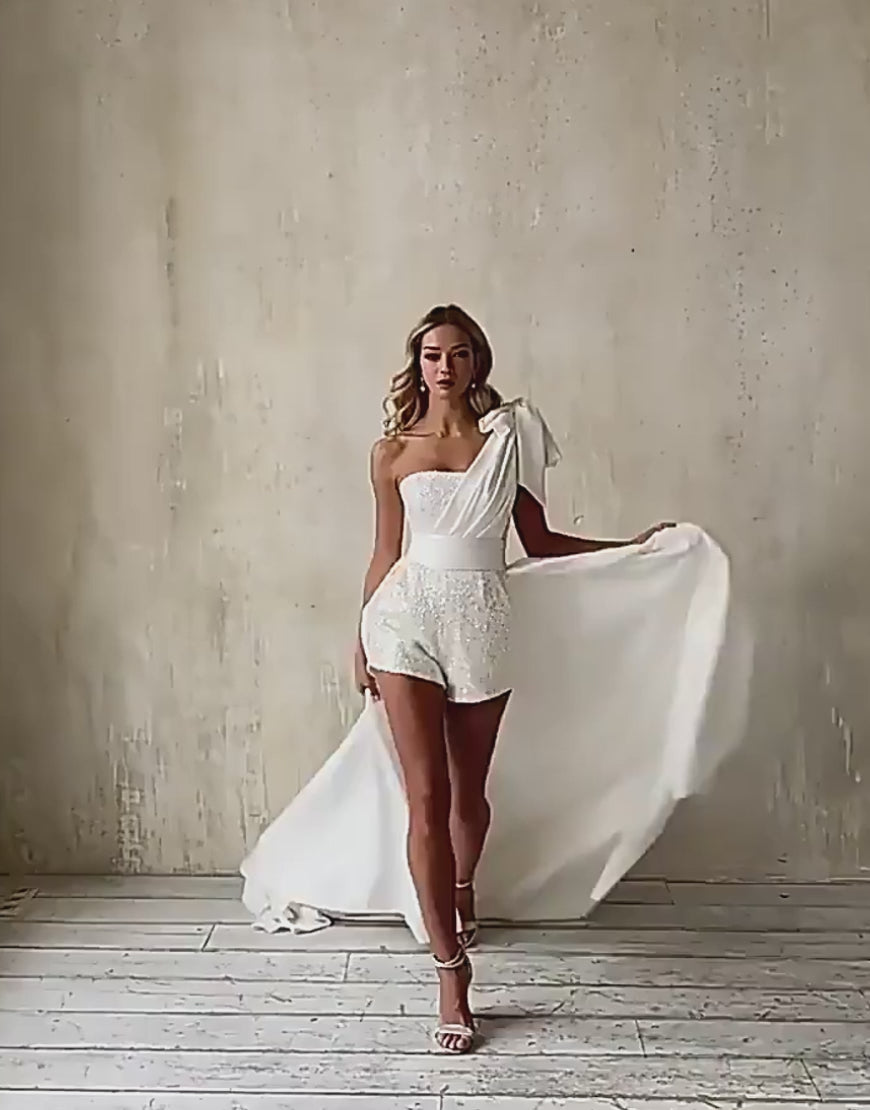 White One Shoulder Glitter Short Homecoming Jumpsuits with Train