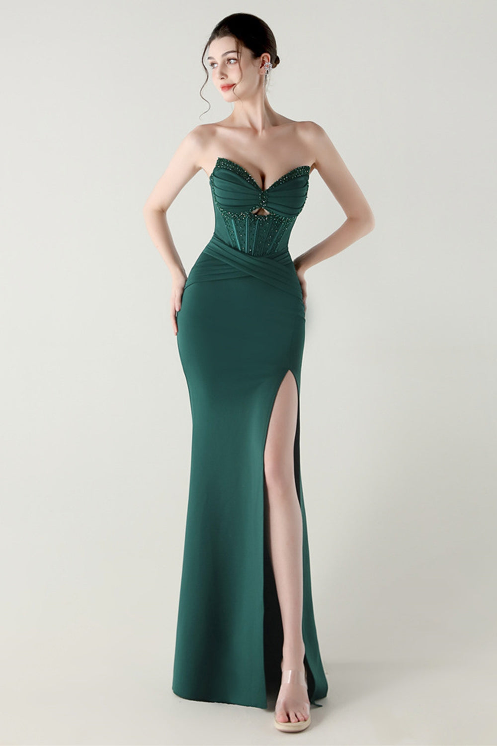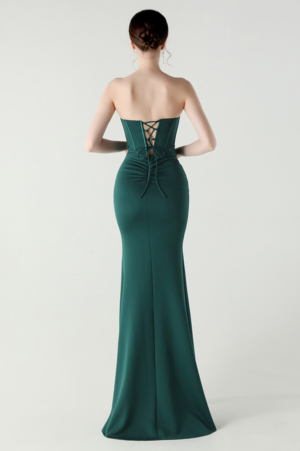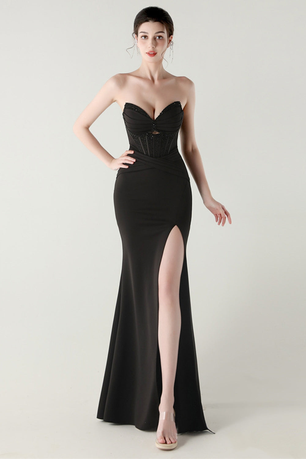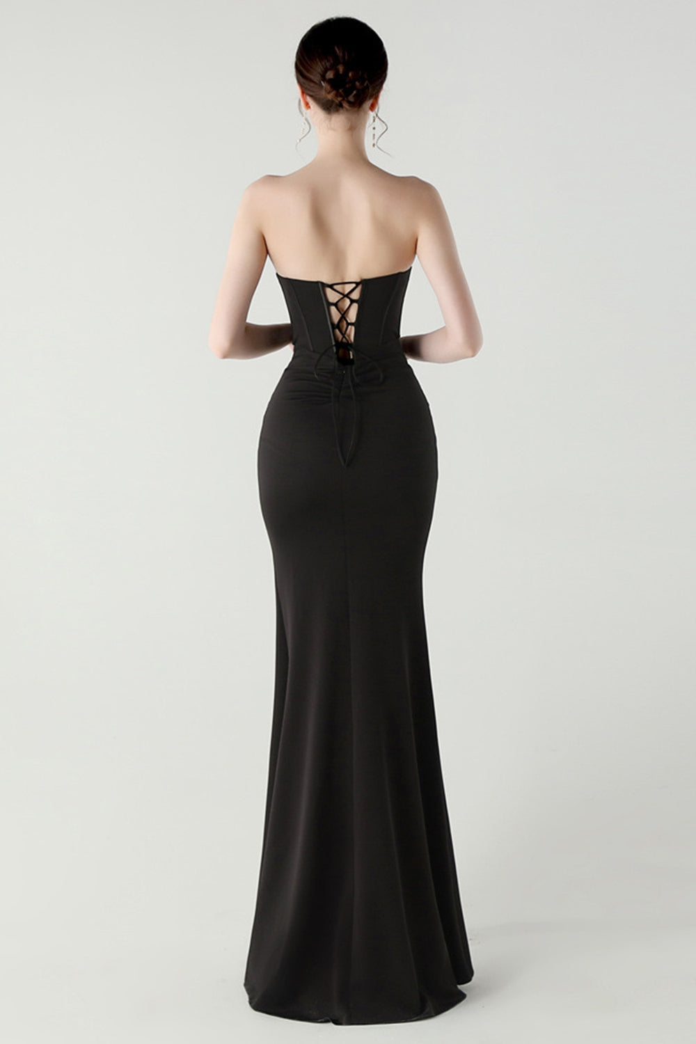 Black Strapless Sheath Corset Long Prom Dress with Slit