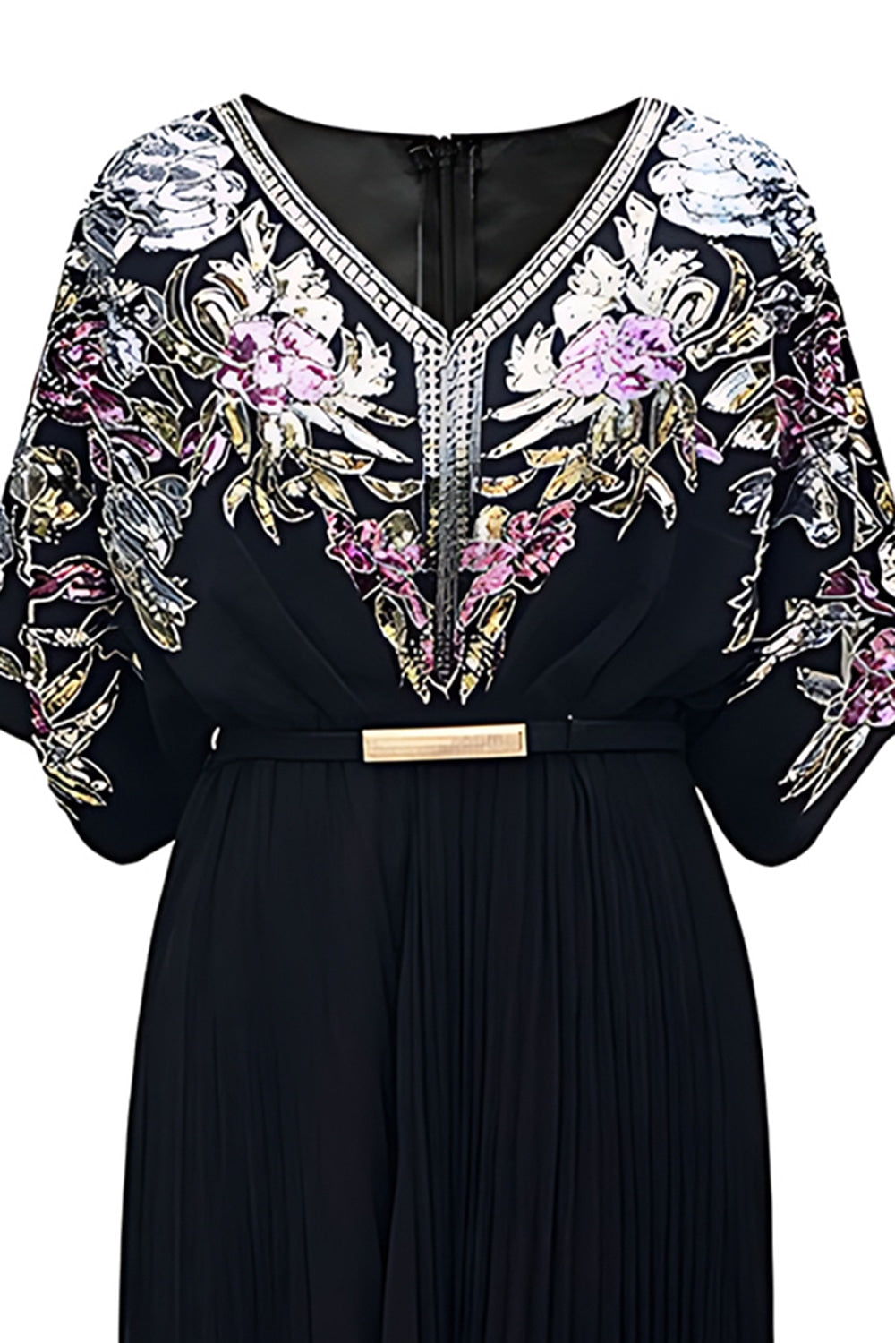 Black V Neck Floral A Line Long Formal Dress with Sleeve