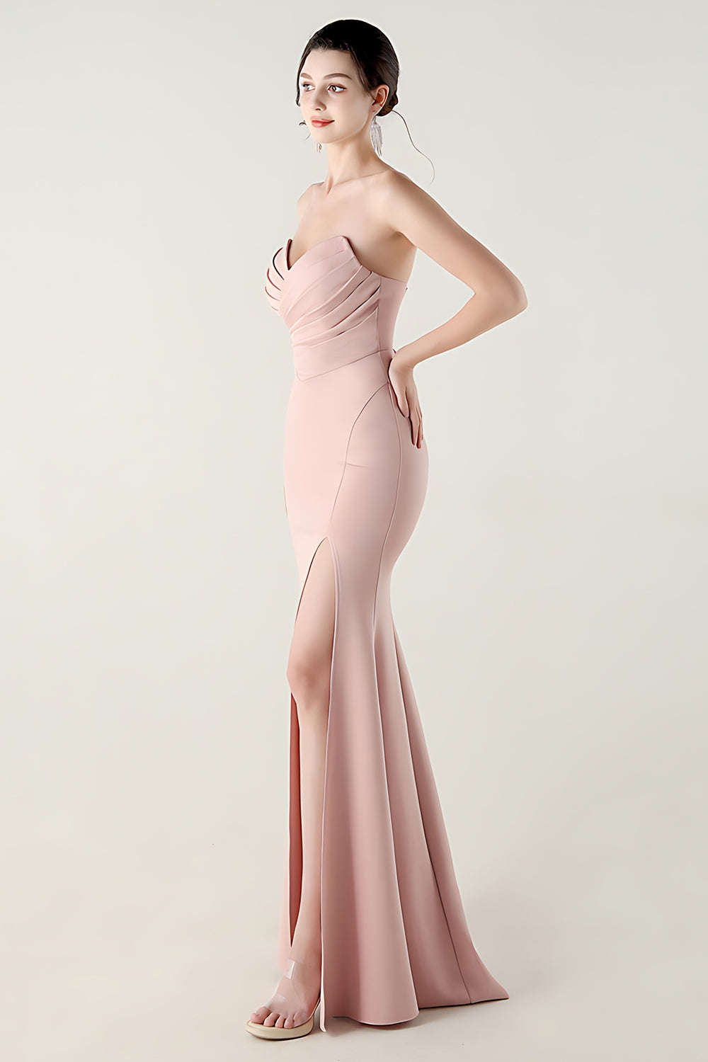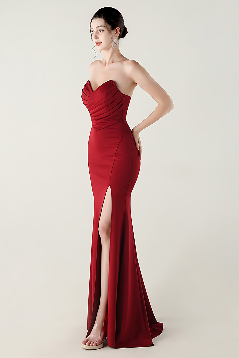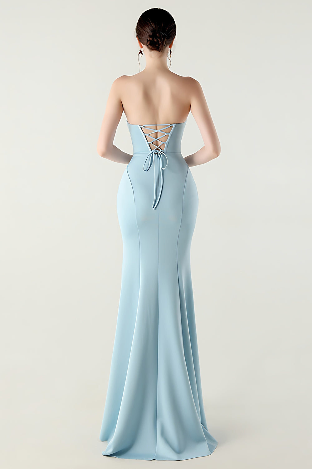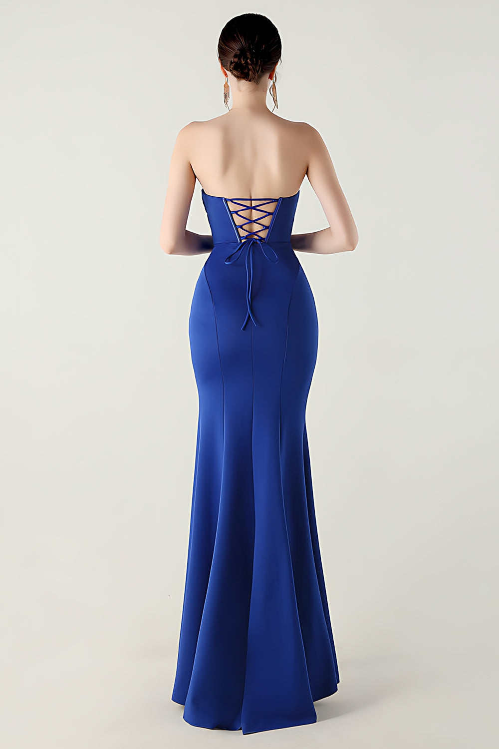Blue Strapless Pleated Sheath Prom Dress with Slit