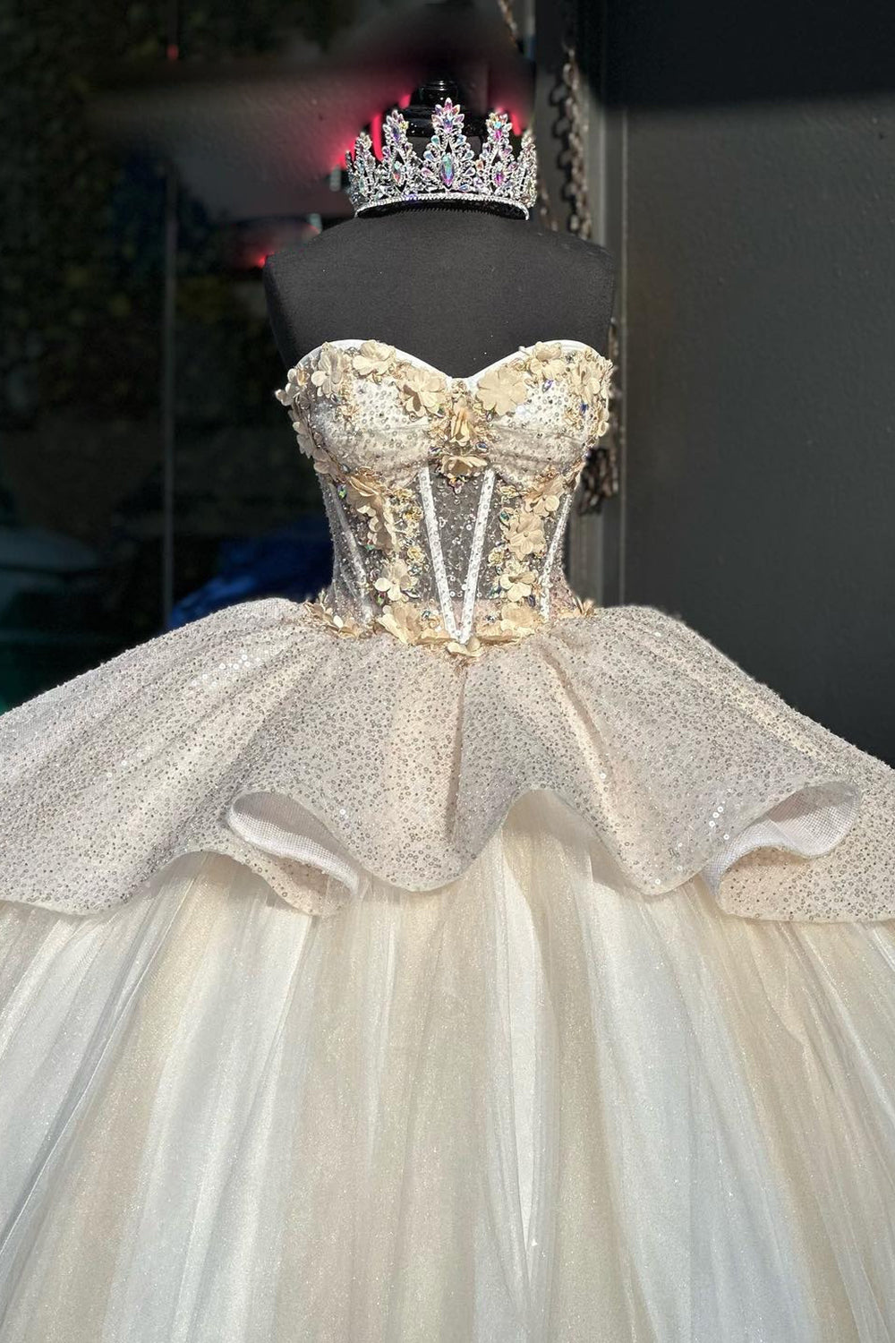Apricot Tulle Sparkly Beads Appliques Strapless Corset Quinceanera Dress