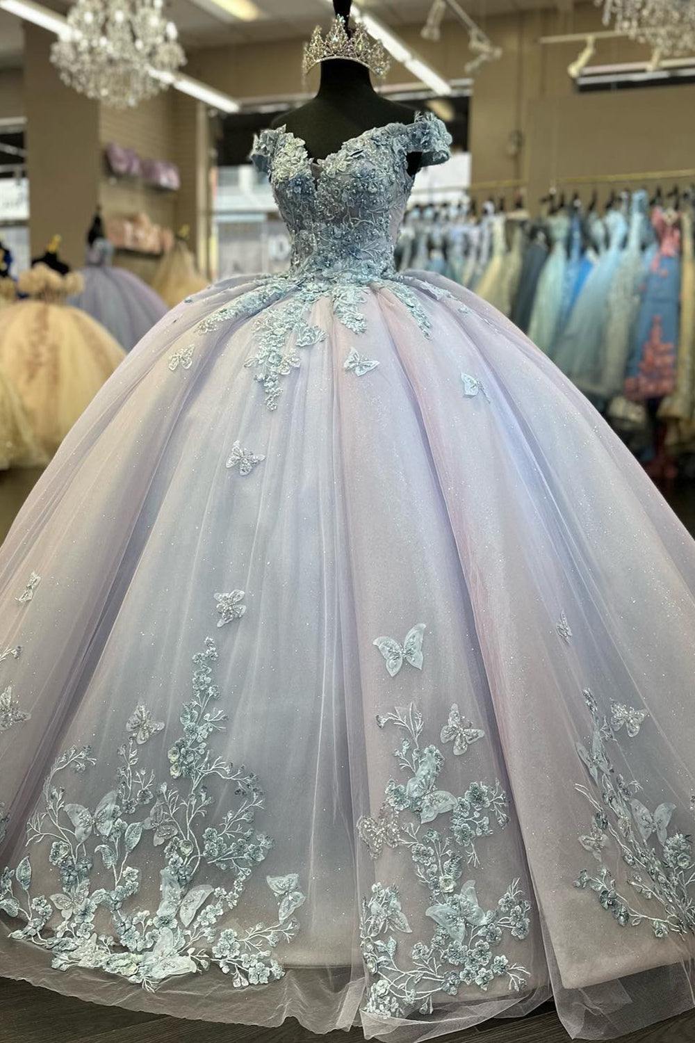 Butterfly Appliques Blue Tulle Beads Off the Shoulder Quinceanera Dress
