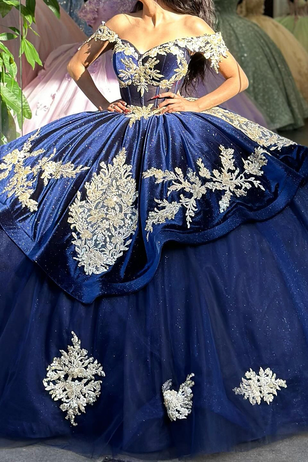 Navy Sparkly Beads Appliques Corset Off the Shoulder Quinceanera Dress