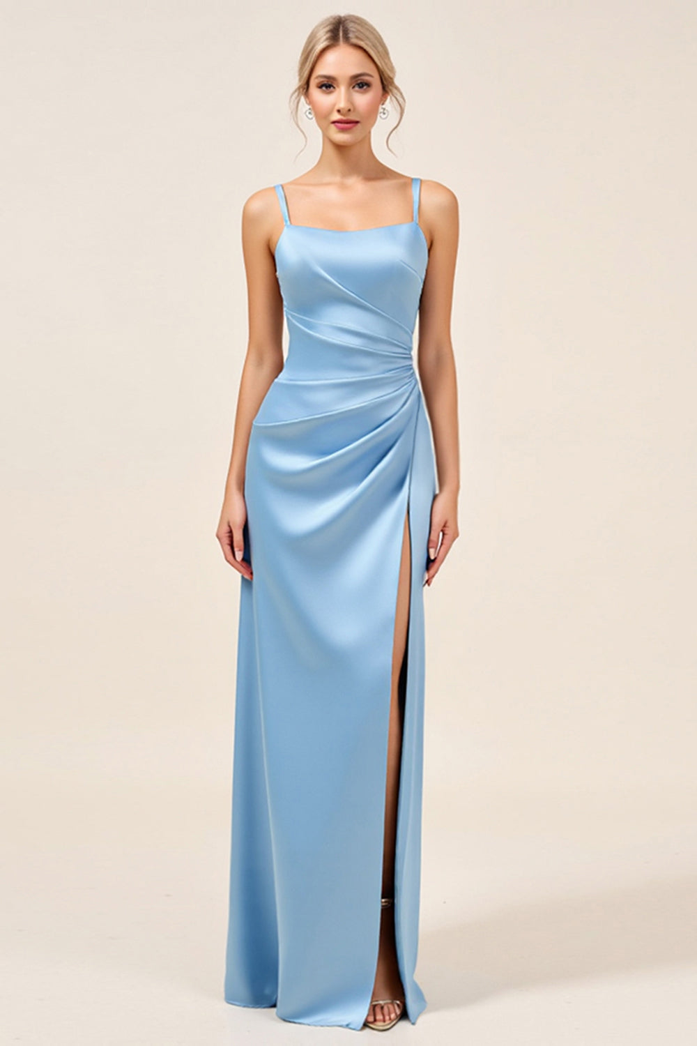 Dusty Blue Sheath Satin Spaghetti Straps Long Bridesmaid Dress with Slit