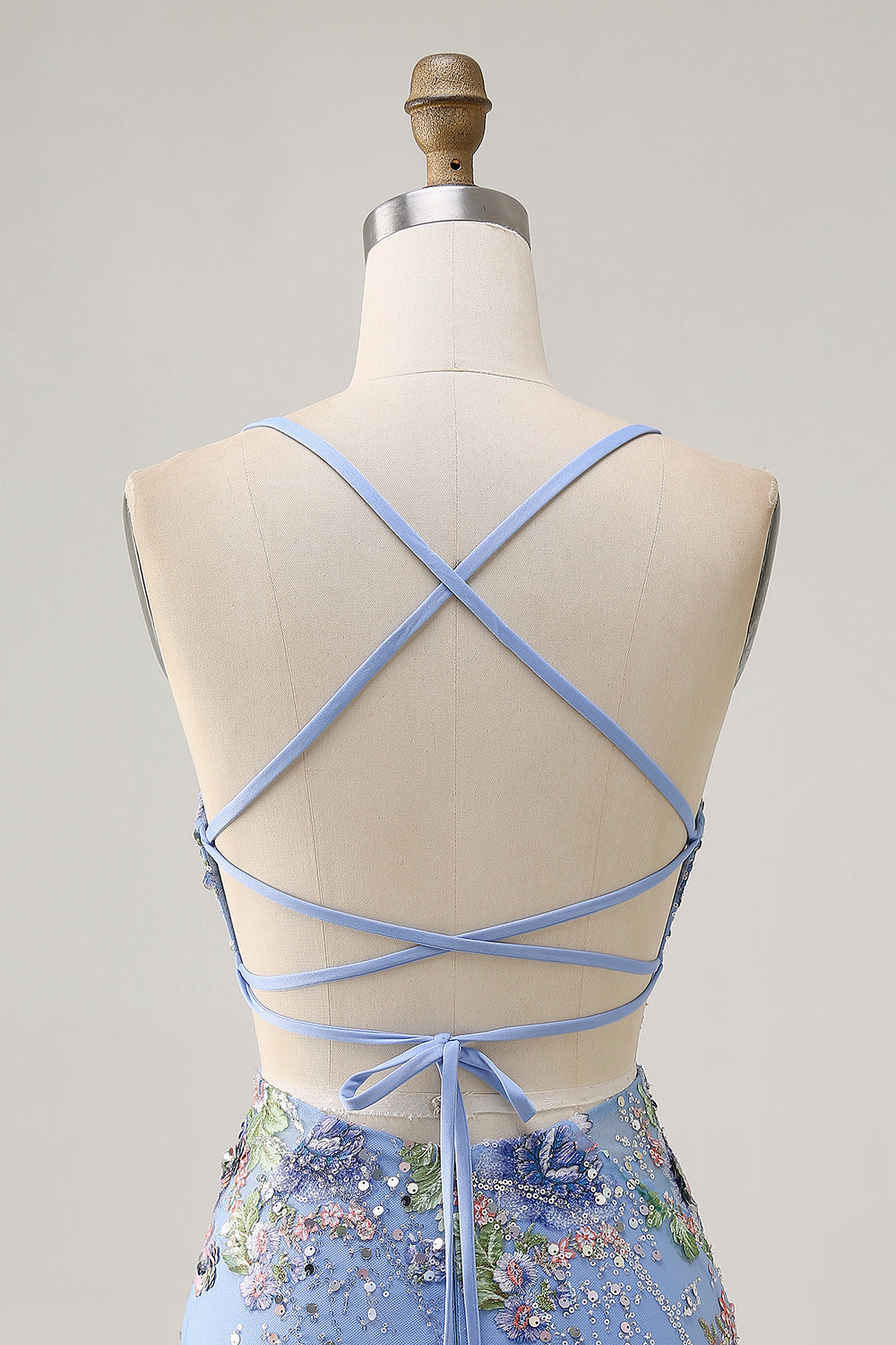 Floral Blue Appliqued Homecoming Dress with Sequins