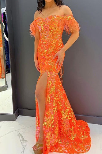 Glitter Orange Off The Shoulder Mermaid Long Prom Dress With Feather And Split