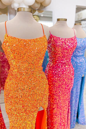 Sparkly Orange Mermaid Spaghetti Straps Long Sequin Prom Dress