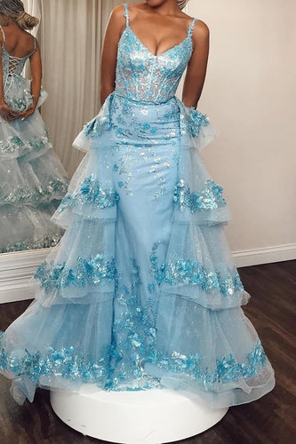 Sequin Light Blue Mermaid Spaghetti Straps Sweep Train Prom Dress