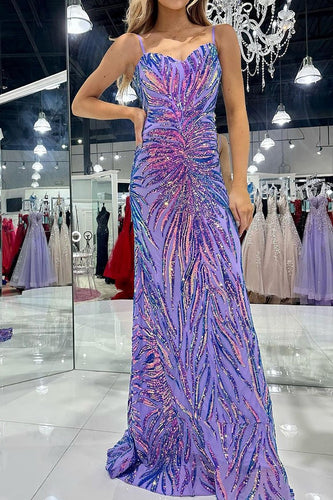 Sparkly Sequin Mermaid Purple Spaghetti Straps Long Prom Party Dress