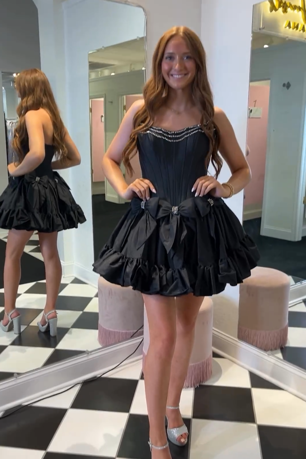 A-Line Sparkly Black Beaded Ruffle Corset Homecoming Dress with Bow