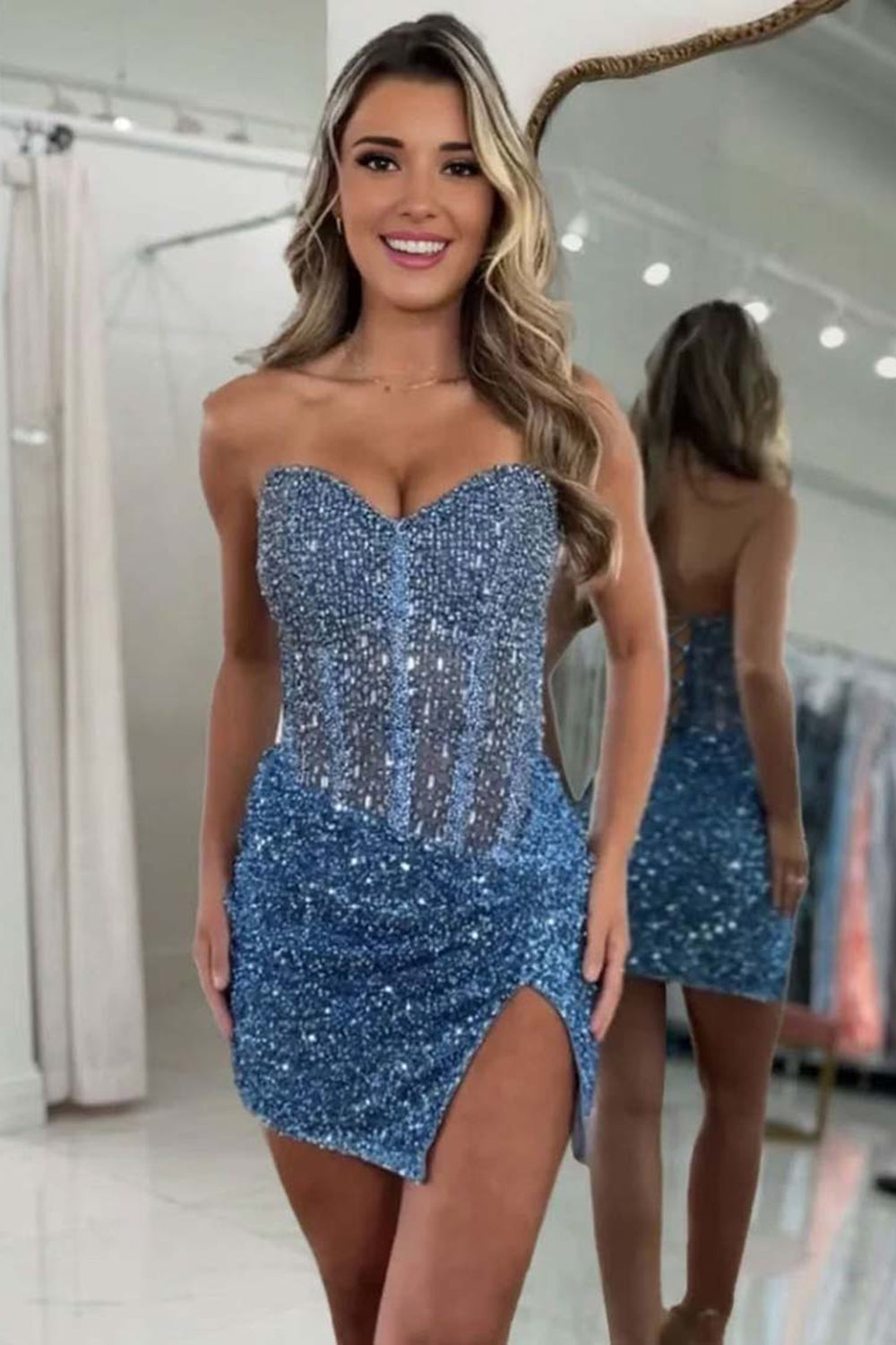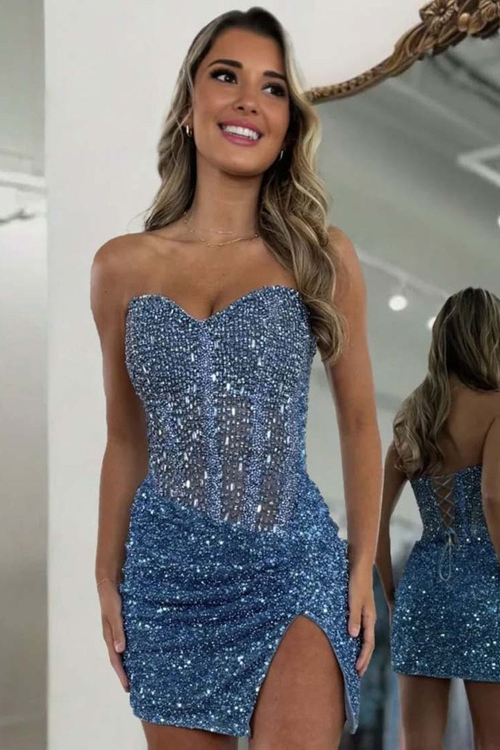 Sparkly Blue Strapless Corset Short Homecoming Dress with Sequins