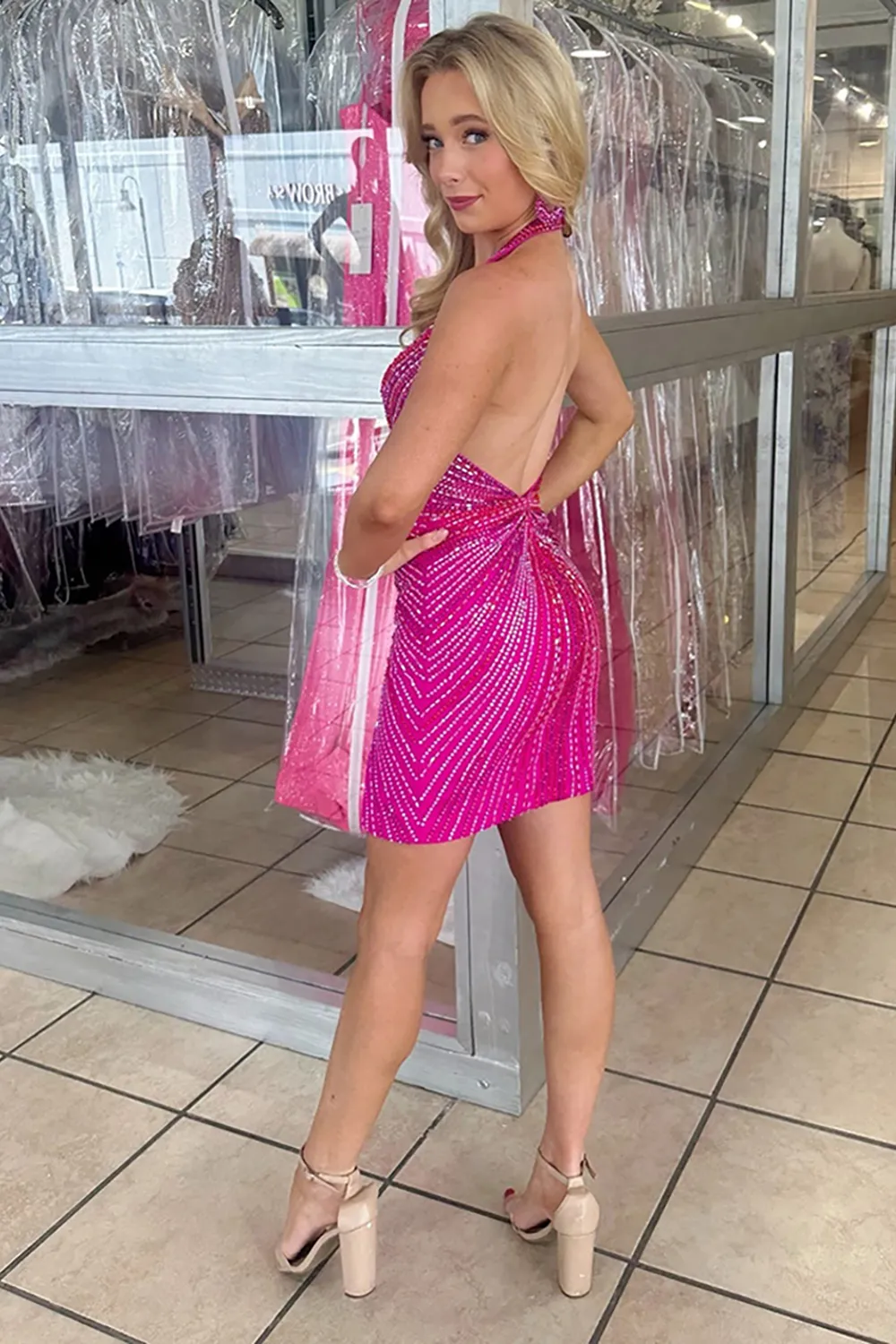 Sparkly Fuchsia Halter Beaded Bodycon Short Homecoming Dress with Slit