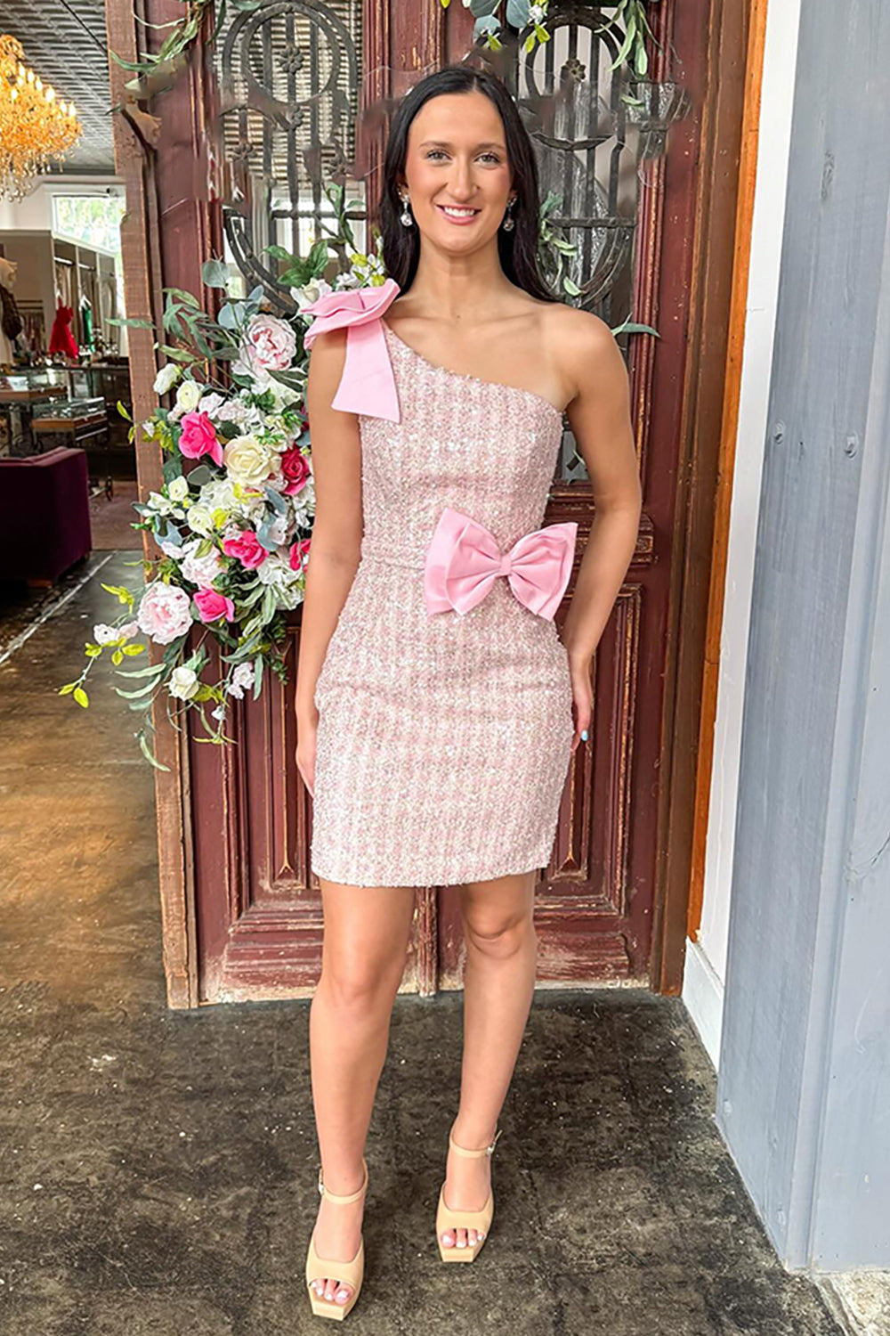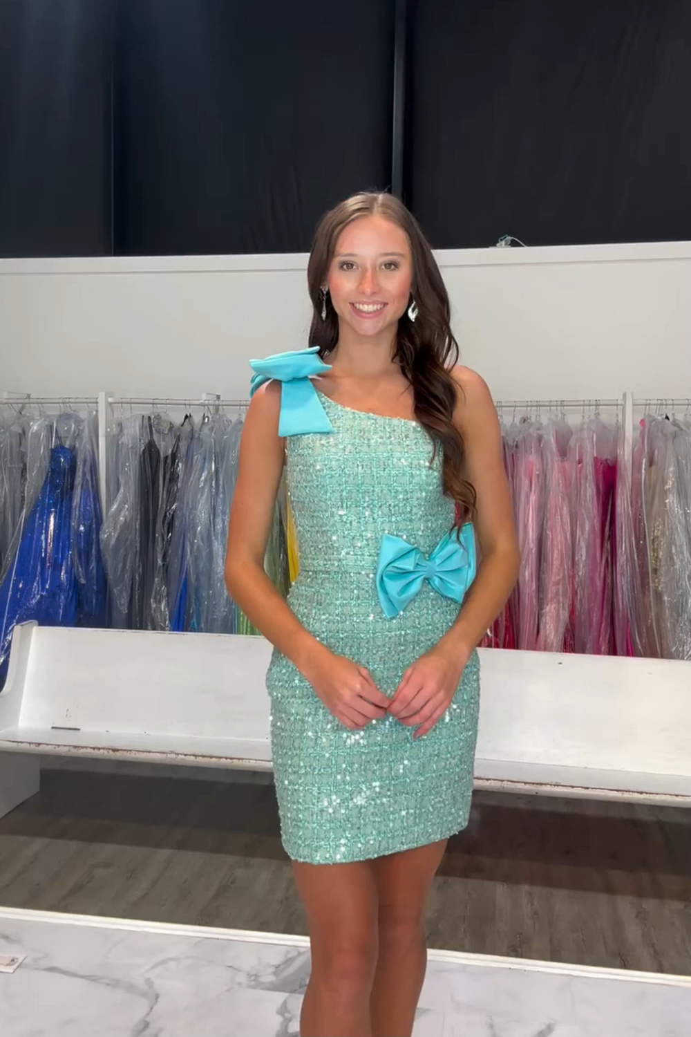 Sparkly One Shoulder Green Tight Homecoming Dress with Bows