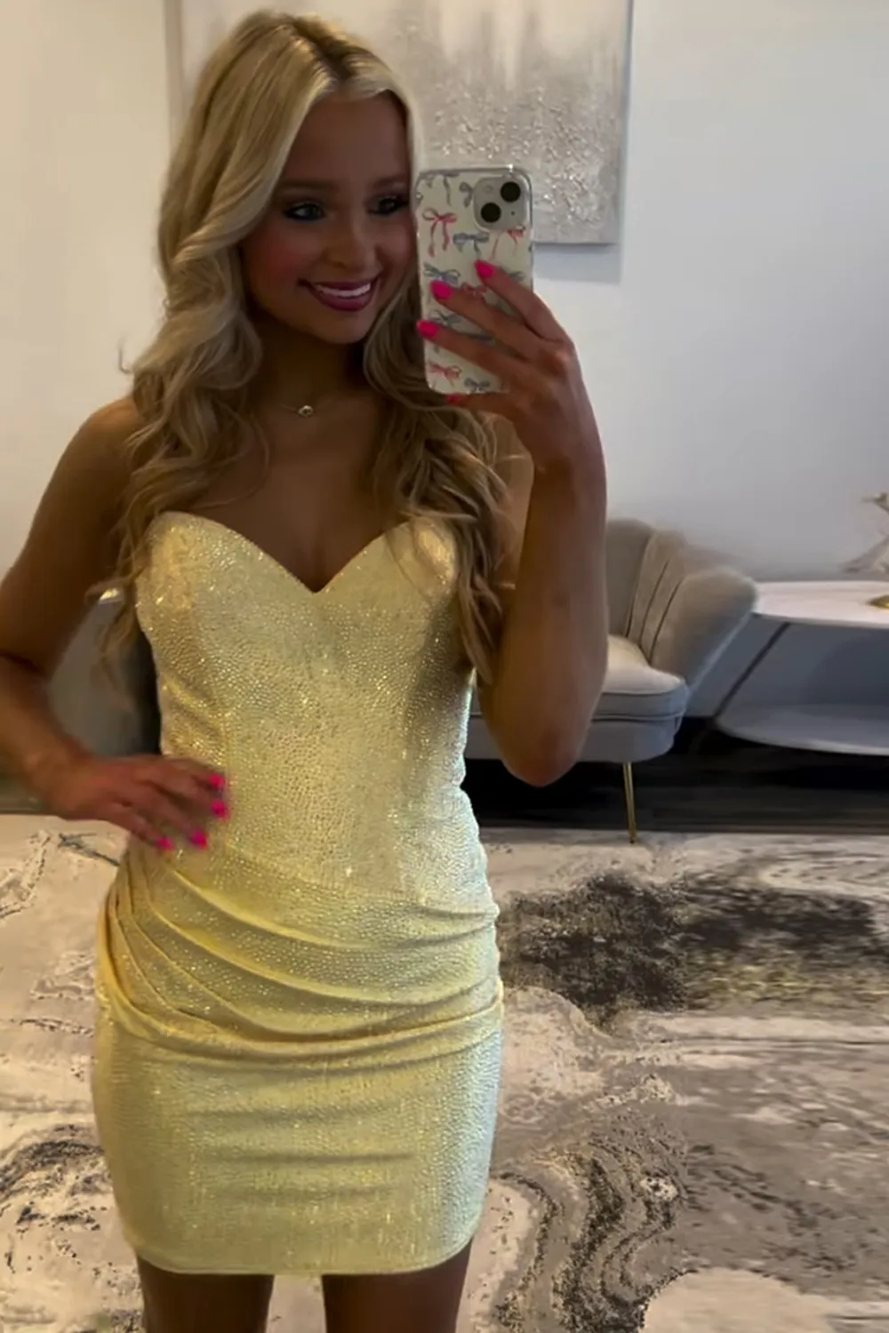 Sparkly Yellow Strapless Ruched Bodycon Short Homecoming Dress with Beading