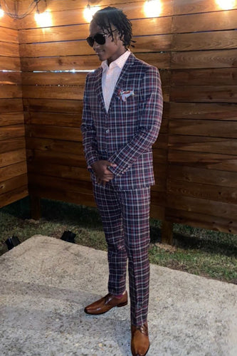 Burgundy Notch Lapel Plaid Vested 3 Piece Men's Suit