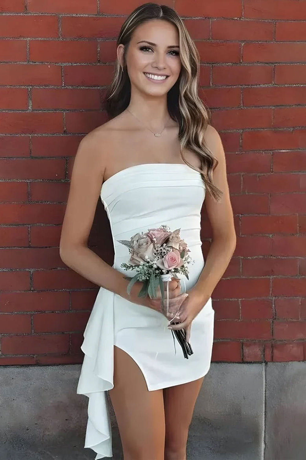 White Strapless Bodycon Midi Homecoming Dress with Ruffled