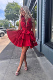 Red A Line Deep V Neck Tiered Homecoming Dress with Ruffles