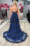 Sparkly A Line One Shoulder Navy Long Lace Prom Dress with Split