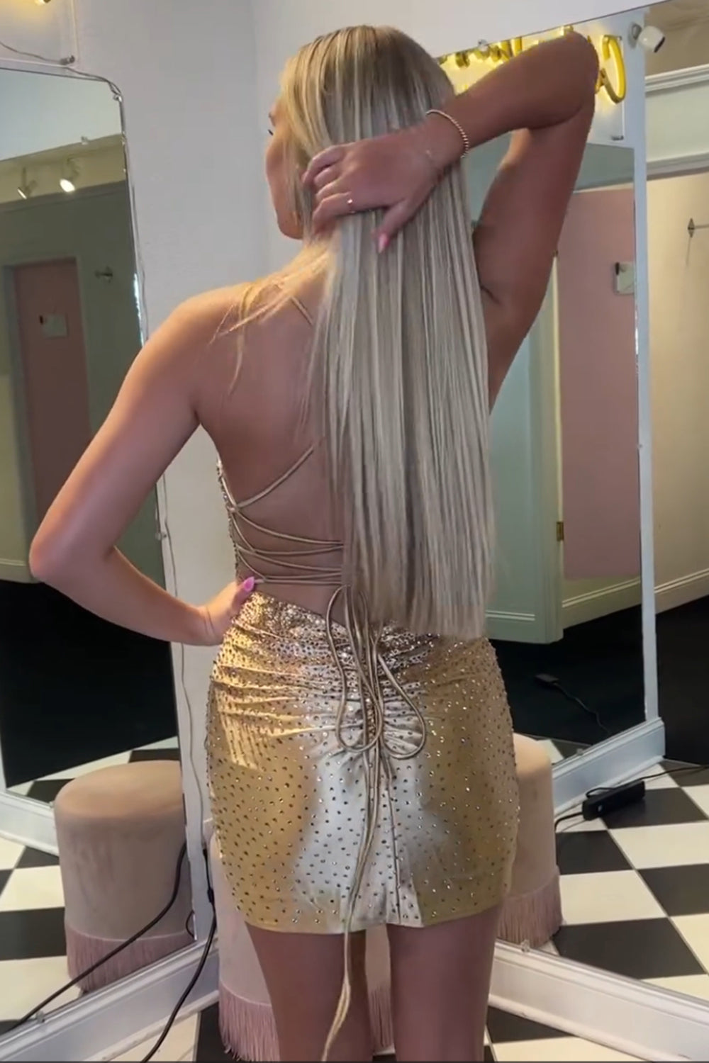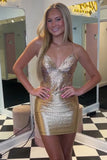 Sparkly Sequins Golden Bodycon V Neck Homecoming Dress with Lace Up Back
