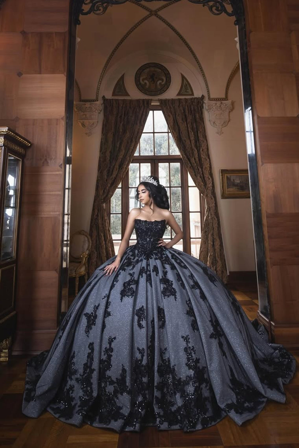 Strapless Sparkly Appliques Black Corset Off the Shoulder Quinceanera Dress
